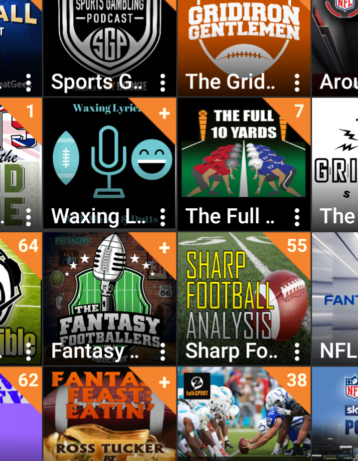 A mix of fantasy, gambling and general NFL based stuff, during the season I listen to about 4 hours a day, a little less during the off-season where I move on to audiobooks for a little bit of a break. I’ll split them down a little, US-Based, UK-Based…