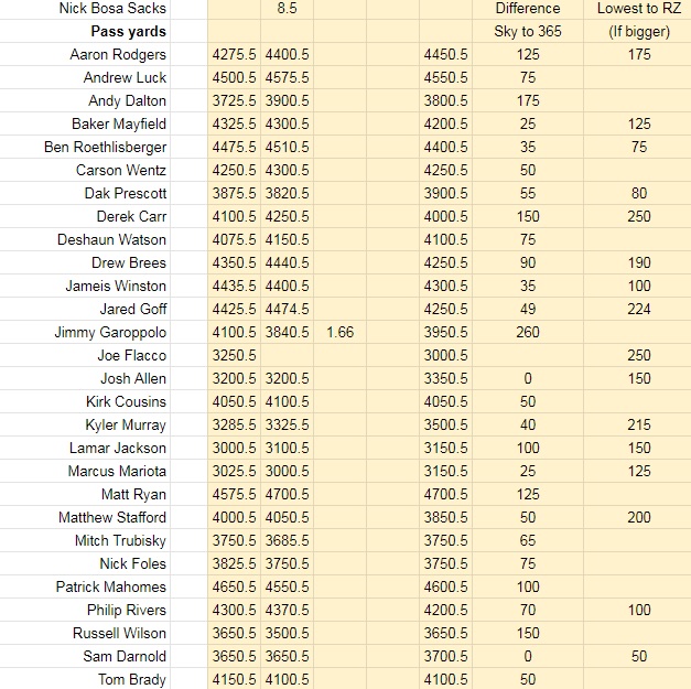 I’m not too surprised to see the next two QBs with large discrepancies across the books because frankly I haven’t got a clue how either of them will do this year, both with 250 yards gaps.
