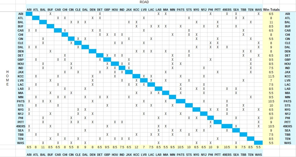 So, what I’ve done here – To work out Strength of schedule I’ve got a full fixture sheet for teams, obviously we don’t know dates yet, but home/road is all on there with the win totals for each team at the end of the columns/road. As far as I know there’s not a fixture sheet like this out there, so you’re welcome. It took fucking ages.