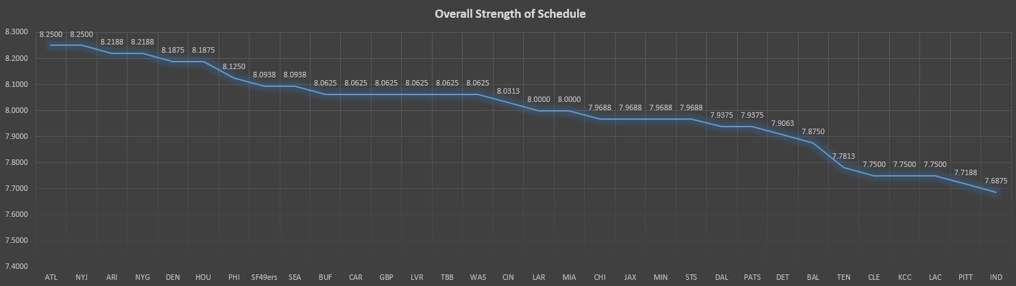 The Falcons and the Jets have the hardest schedules, the Colts and the Steelers the toughest predicted schedule.