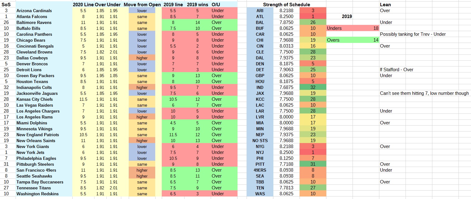 The Los Angeles Chargers could be a horrible mess this year. They let their QB go, could be a good thing as he wasn’t great last year) but don’t really have a replacement. They’ve got the 6th pick and mocks seem to have Herbert being there for them, so they’ll likely get him. Gordon and Ekeler are both out of contract. They’re going to essentially be playing 16 (or 17) road games this year as they move into the new LA stadium which seats 70,000. The Chargers don’t have any fans. They’ll have 10,000 max? It could be toxic. I’ve got to go under 7 wins for them.