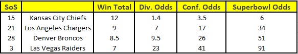 I think the Chiefs are rightfully favourites for a return to the Superbowl and as such I can’t see past them winning this division as long as their 3 key players stay healthy for most of the season.