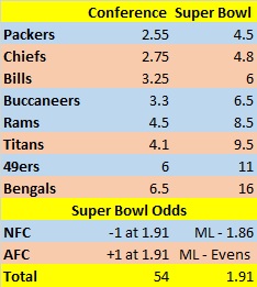 Below are the current odds at Redzone, the Moneyline for the Super Bowl is a little better at Evens on William Hill over 20/21 at Redzone, so I’ve put that price in there. They are 1.83 on the NFC. – The standard line all year has been NFC -3, so it’s come down now that they know that one of the Chiefs or Bills is likely to make it and the scoring ability those two teams have shown. A 54 point total means it would be a heck of a game at least.