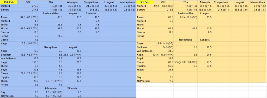 Longest receptions match bet – Van Jefferson v Tyler Boyd – 1.83 (Paddypower, on Super Bowl Player props)