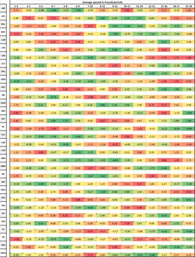 This next image may look a little convoluted, but that’s average point spreads over 4 game periods, week 1-4 onwards, until the end of the season, obviously looking at the above you can see that the Bengals have a rough post-bye schedule and that plays out in the table below as the toughest area of their schedule, while the likes of the Chiefs and Titans will be expecting to make the post-season and finish with the softer parts of their respective schedules.