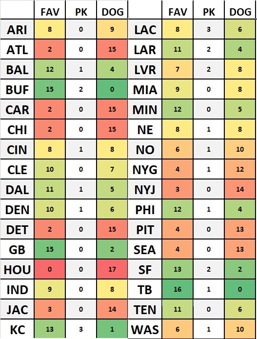 It gets even worse for Texans fans as they aren’t just underdogs in all their games, they’re at least 3 points underdogs in all bar one (hosting the Jaguars) while the Bills are heavy faves in most with 13 of their games expected to be won by at least 3 points.