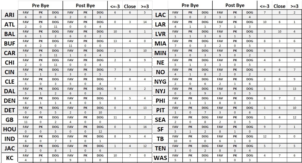 After the schedule release we are able to have a look at how teams will be playing their season, I’m not entirely sure there’s a whole lot of relevance, but I had a look at how they far either side of their bye week, as well as how many they’re favored for on the season as a whole. Superboook based in Vegas recently put out some lines for every game of the season, so I’ve had a look into those as well.
