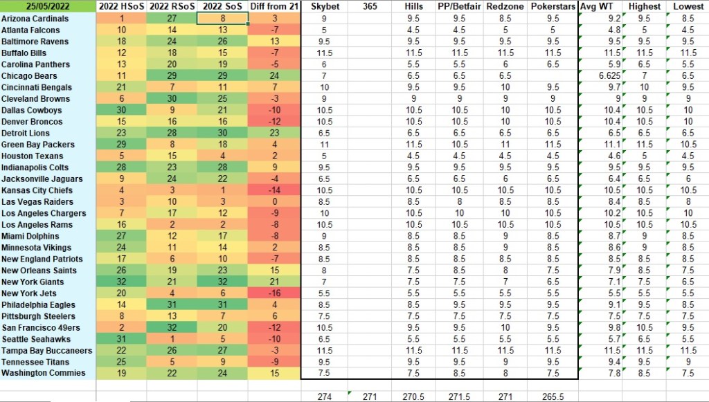 So, in the image below you can see (I believe) Home SoS, Road, Overall, and the difference in SoS from 2021 as well as the average win total across the books and highest/lowest available. There’s still not many places listing the Browns with the worries of Watson (I personally believe he’ll get at least 6 games, but who knows) and the Bears are off the board at PokerStars for some random reason. At the bottom I’ve totaled the games. It’s usually above the number played so going under on totals is always the first look.