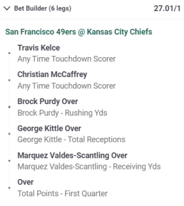 I like the “Player to catch a pass on the 1st drive” market, Far better pricing on PaddyPower than Skybet… Kelce 5/6 seems like a banker if they get at least one first down, and 4/1 on 2+ is tempting as well. – For the 49ers I obviously like Kittle at 9/5, 8/1 on him seems a nice price too if you want to risk it a bit more.