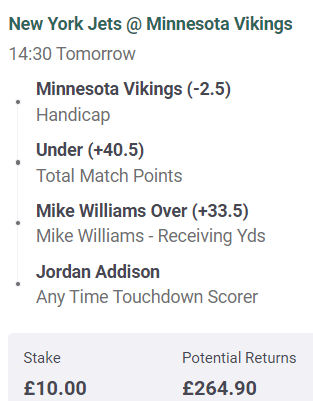 The Jets are sitting at 2-2 in a division that’s blown wide-open with Tua out for the Dolphins, the Patriots being terrible and the Bills stuttering every time they face a half-decent team, they do need to get back on track this weekend though to keep themselves in touch of the Bills at the top. The Vikings on the other hand are the surprise team of the league so far this year with Sam Darnold guiding them to an unbeaten start, something that I highly doubt would have happened with JJ McCarthy under center.