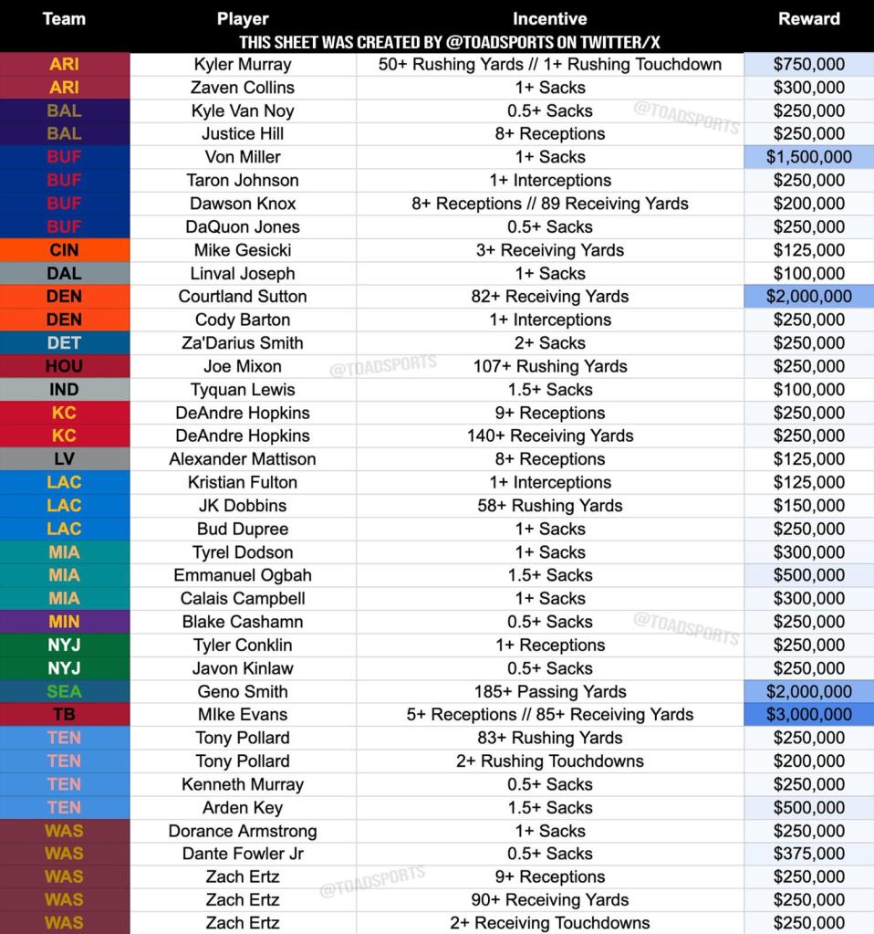 There’s far too much information out there about incentives for players so it’s impossible to even find value on those this weekend either. You can see the list below, shared by @toadsports which lists a lot of them, obviously, the highest values are probably the ones to keep an eye on but the lines on those players aren’t very helpful for us.